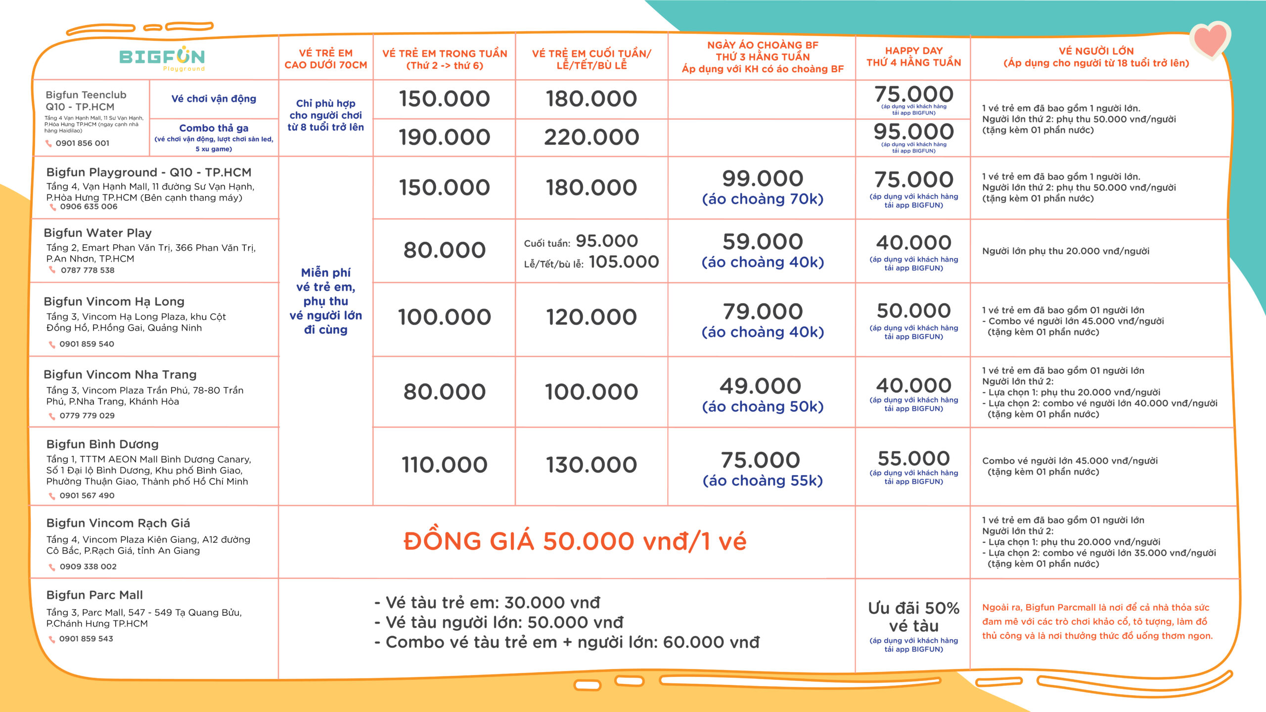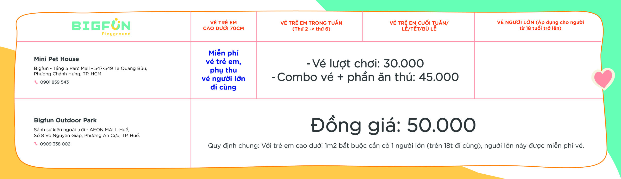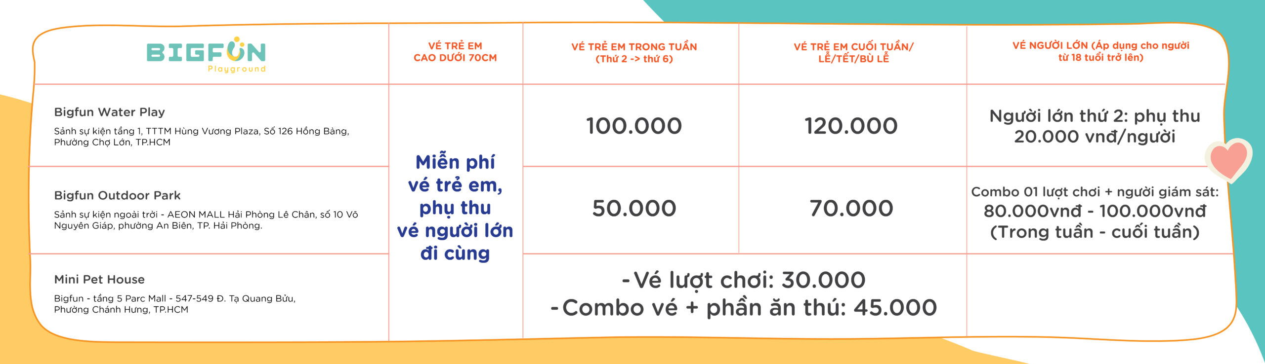 Vé phụ huynh thứ 2: 50.000đ/người (tặng kèm 1 phần nước)